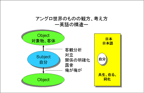 モノを観る方式は、言語の構造に反映される。モノを考える順序は、そのまま言語の順序に反映される。