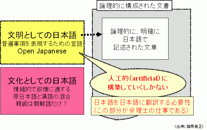 世界の人々を相手として意識したときに、誰にでもわかる平明な表現というよう なことを、われわれは意識してきたであろうか。そのための努力をしてきたであろうか、 否である。 世の中に溢れている日本語文章の特徴の一つは、文字が意味を持つ漢字に依存して、私が何を言いたいか「お察し願います」というスタイルであり、受け手(読み手)も 「およそこのような意味なのでしょう」とわかったつもりで収めてしまうところにある。
