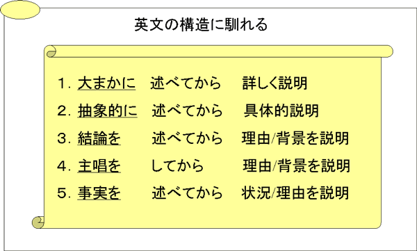 英語を読むという作業の第一は、英語文章の構造を理解するところから始まる。構造を静的に把握し、自分で表現する時には構造的に構築するように心がける。